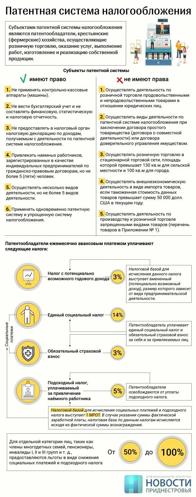 В качестве иллюстрации рассмотрим пример реального человека — предпринимателя N из Тирасполя. Сегодня он работает по патенту в небольшой мастерской без наемных работников, осуществляя три вида деятельности: изготовление изделий народного художественного промысла и их реализацию, реализацию фотографий собственного изготовления, пошив швейных изделий. С учетом 70%-ной льготы (как защитнику Приднестровья) патент обходится предпринимателю в 90 рублей ежемесячно.