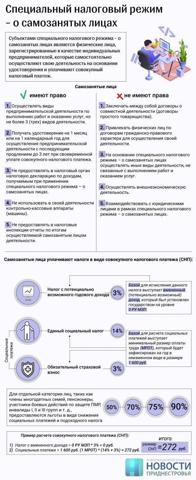 Первый и самый простой вид налогообложения предназначен для самозанятых. Это новое понятие в приднестровском законодательстве. Под ним понимаются физические лица, зарегистрированные в качестве индивидуальных предпринимателей, которые благодаря своим знаниям и умениям работают, обеспечивая себя и свою семью. Таким ИП станут выдавать не патенты, а удостоверения на занятие одним или несколькими видами деятельности (максимум — тремя).
